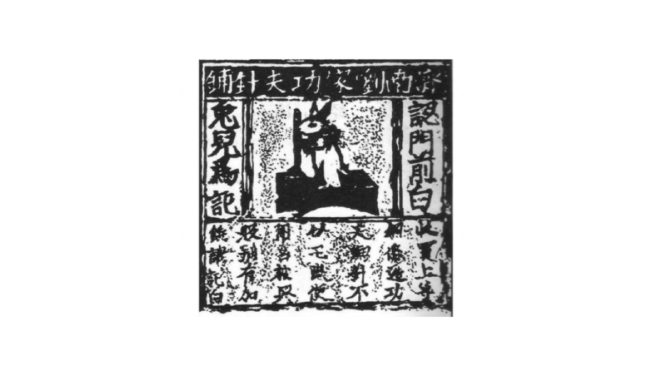 這是中國現存最早的一份印刷廣告,是宋代劉家功夫針鋪廣告,同時也是一張包裝紙, 銅版正中偏上刻著一只拿著鐵杵搗藥的白兔,白兔四周刻著密密麻麻的小字:上方為“濟南劉家功夫針鋪”;左右為“認門前白兔兒為記”;下方為“收買上等鋼條,造功夫細針。不誤宅院使用,轉賣興販,別有加饒,謂記白”。文字皆為反刻,由此推測這塊銅版應是用來印刷廣告的。它是集包裝紙、傳單、廣告三位與一體的設計形式,具有濃厚的商業色彩。